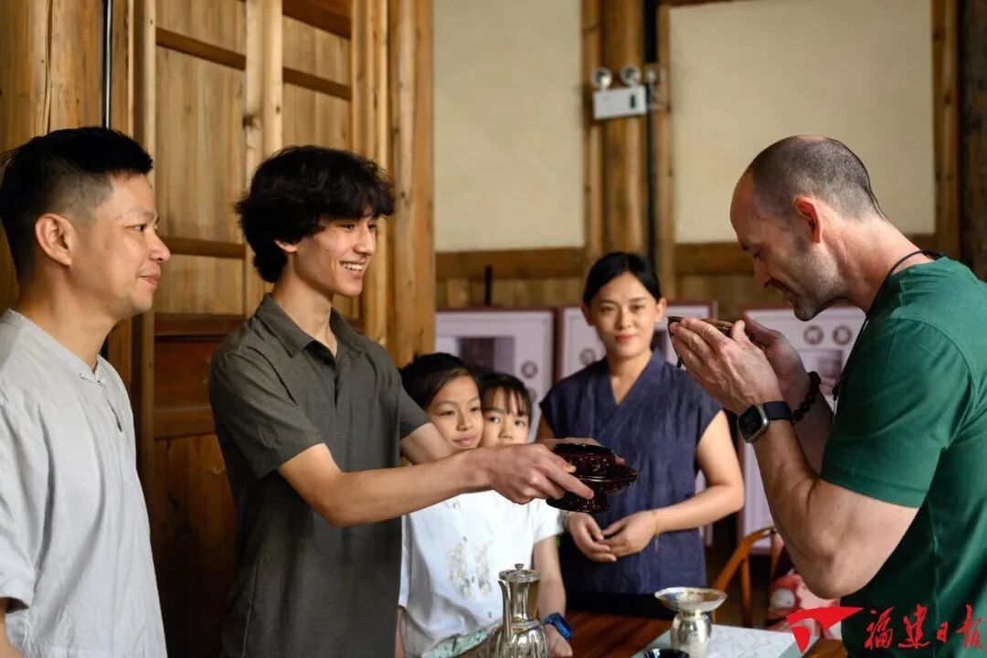 8月13日,位于建甌市鐵井欄—紫芝街歷史文化街區(qū)內(nèi)的建州宋式點茶傳習所內(nèi),北苑御茶制作技藝代表性傳承人方建旭(左)指導查德威克 父子體驗宋式點茶技藝,了解宋代茶文化。