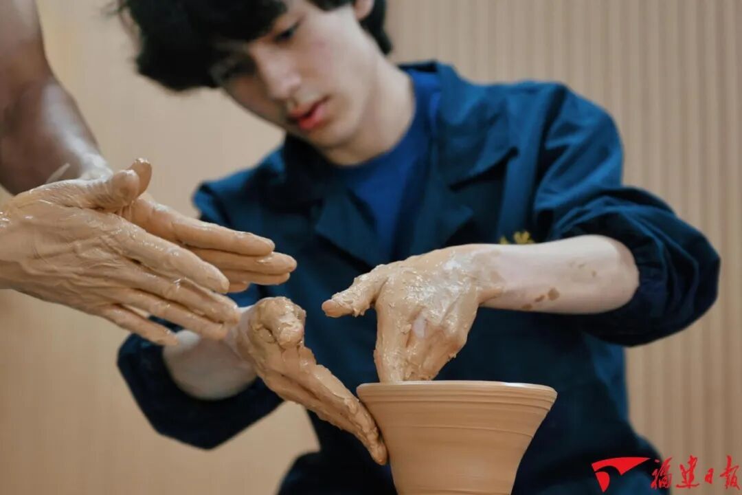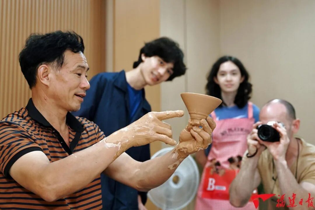 8月12日,黃綱興在工作室內(nèi)手把手教查德威克建盞拉坯技藝。