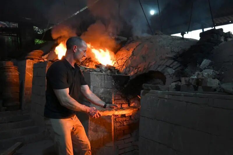 查德威克嘗試使用建盞技藝制作創(chuàng)新的現(xiàn)代家居工藝品,圖為8月12日,他在黃綱興的制坯車間內(nèi)查看由自己設計的一款建盞燈罩的待燒制樣品。
